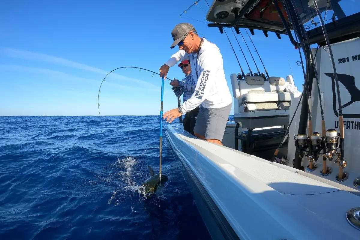 Captain George Gozdz of Jensen Beach, Florida, gaffs a blackfin tuna for angler Terri Magnusson. (Jeff Weakley photo)