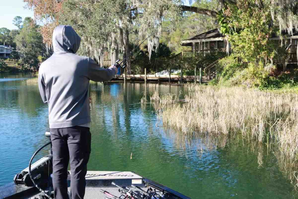 “On the outer edges, you’re looking for points,” Carson said. “Whether it’s lily pads, hyacinth, or hydrilla, those are ambush points for big bass. You pitch on them and they bite right away because they’re ready to eat.