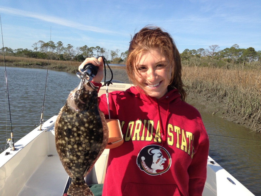 christin-pappas Caught on soft plastic with jig in Ponte Vedra Beach, FL. back water. creeks. Christin bested both Anthony and Capitan Jud Durel with this flounder and a red.
