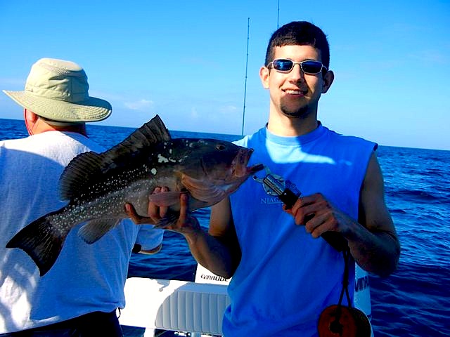 Shawn displays a fat red grouper brought up from the depths.