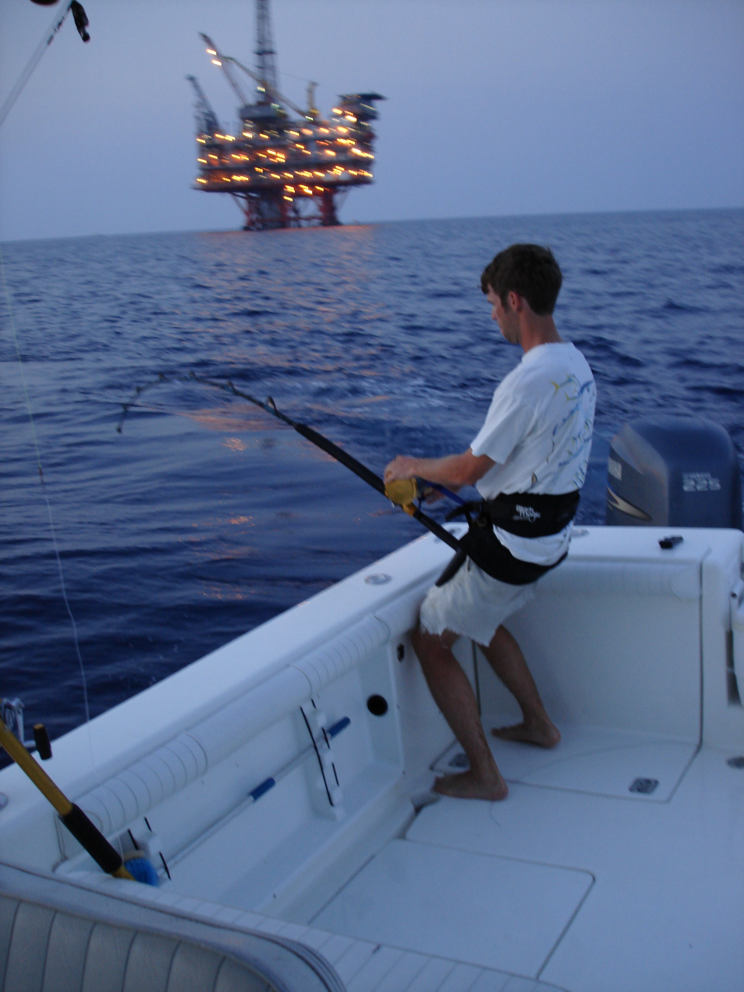 Panhandle Yellowfin Fight A pretty sight indeed, the stand-up 50 wide getting worked by a yellowfin tuna while fishing off of the oil rigs in the panhandle region.